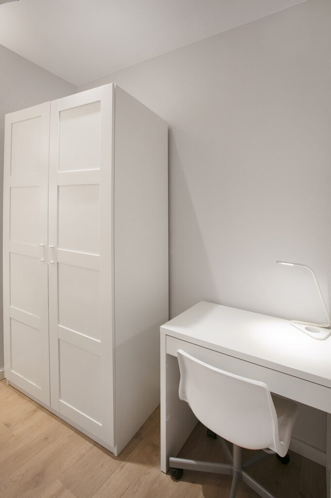 Las habitaciones disponen de cama, mesita de noche, armario, lámpara, ventilador, escritorio y silla de estudio. La cama incluye almohada, juego de sábanas, toalla y edredón nórdico o manta. Todos los pisos tienen TV, sofá, mesa de comedor y sillas, y todas las cocinas están totalmente equipadas con cocina, horno, microondas, nevera con congelador, cafetera, plancha, lavadora, etc…